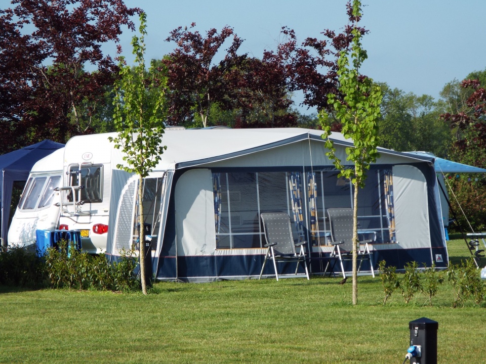 Daarachter bevindt zich een uitgestrekt veld met ruime plekken voor de caravans